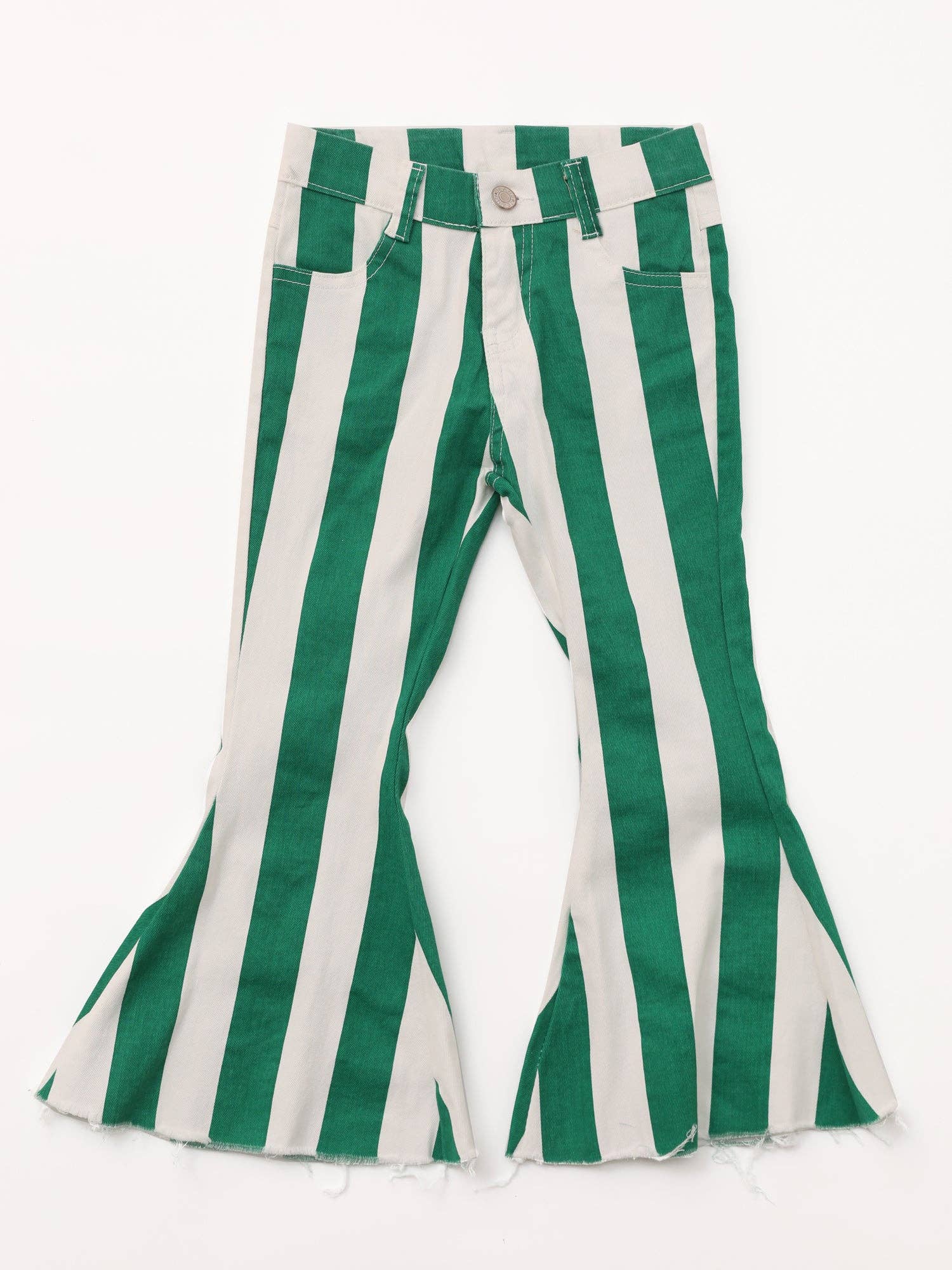 Baby Girls Green Stripe Flare Jeans A versatile addition to any baby girl's wardrobe, these green stripe flare jeans offer both style and comfort. Made with a high-quality fabric blend, these jeans are perfect for everyday wear and will keep your little one comfortable and fashionable all day long.