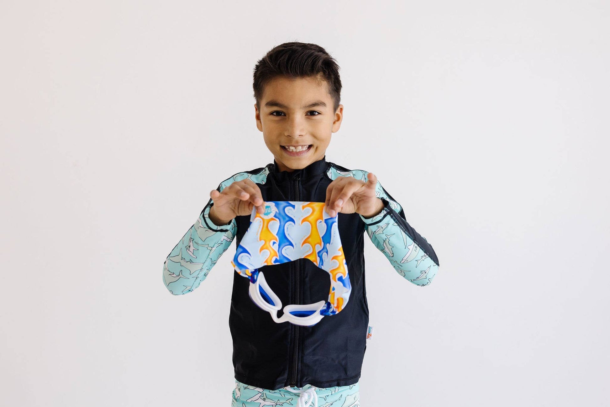 Our Blaze swim goggle features our tangle-free strap in a blue and orang flame print on a light blue background paired with white frames and lightly tinted blue lenses.