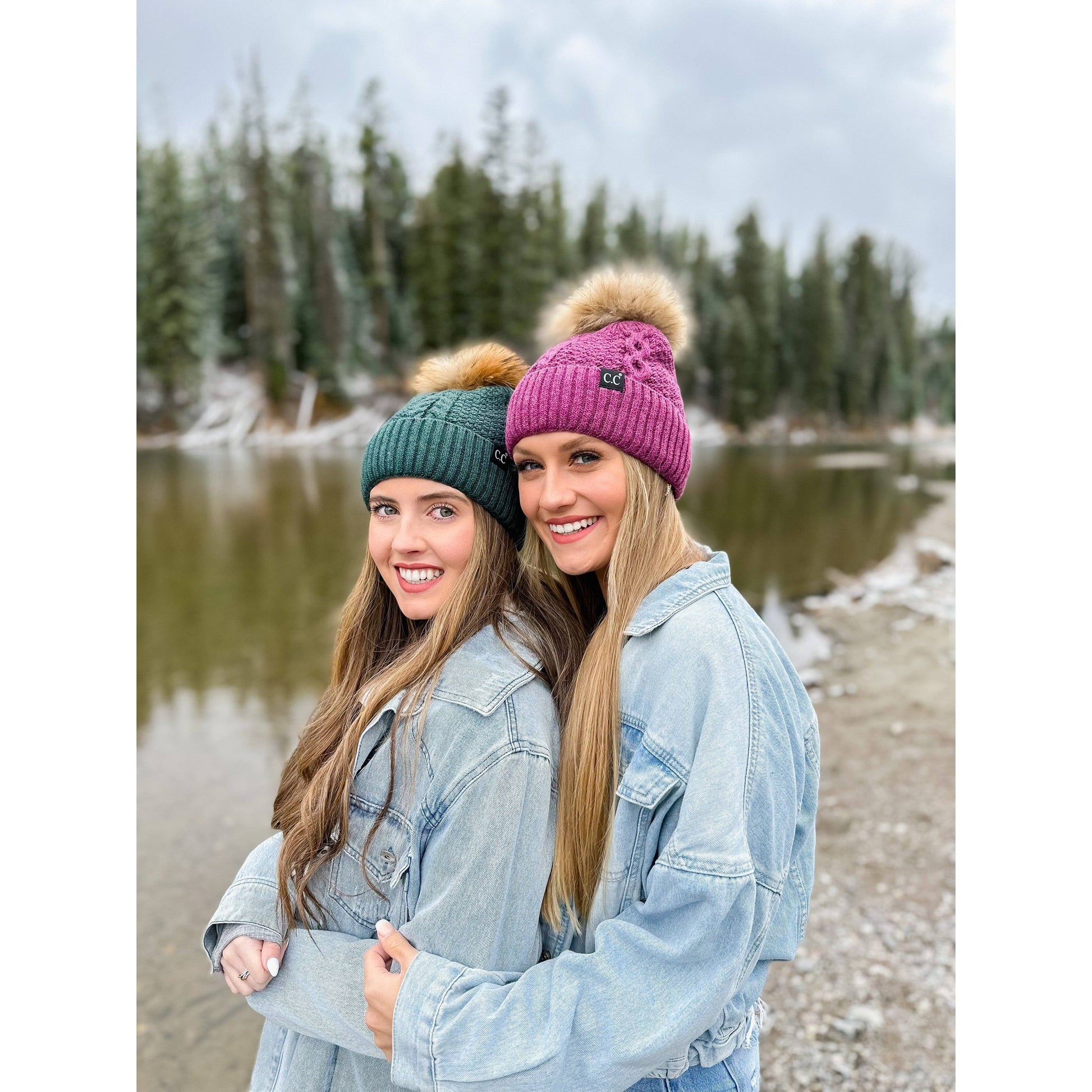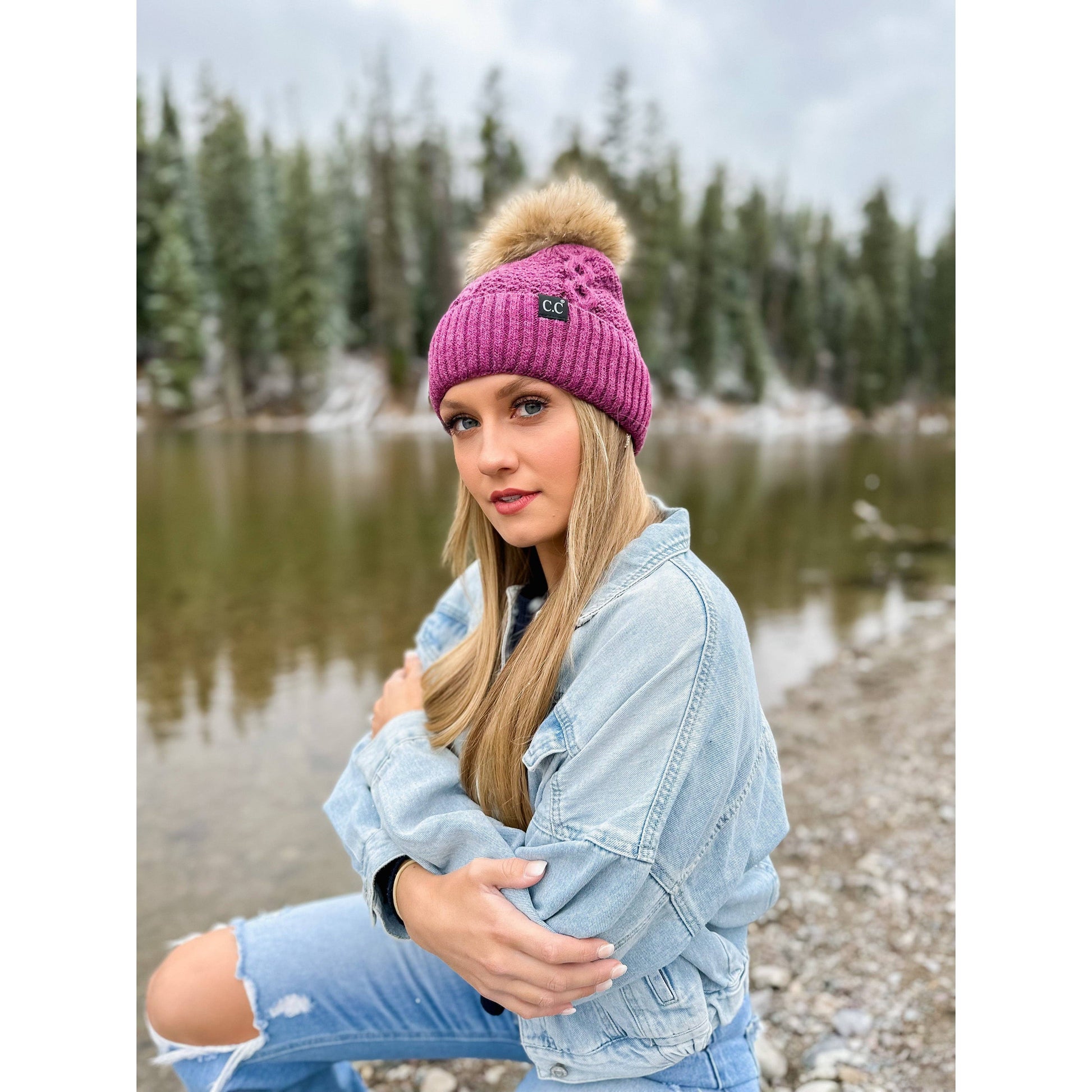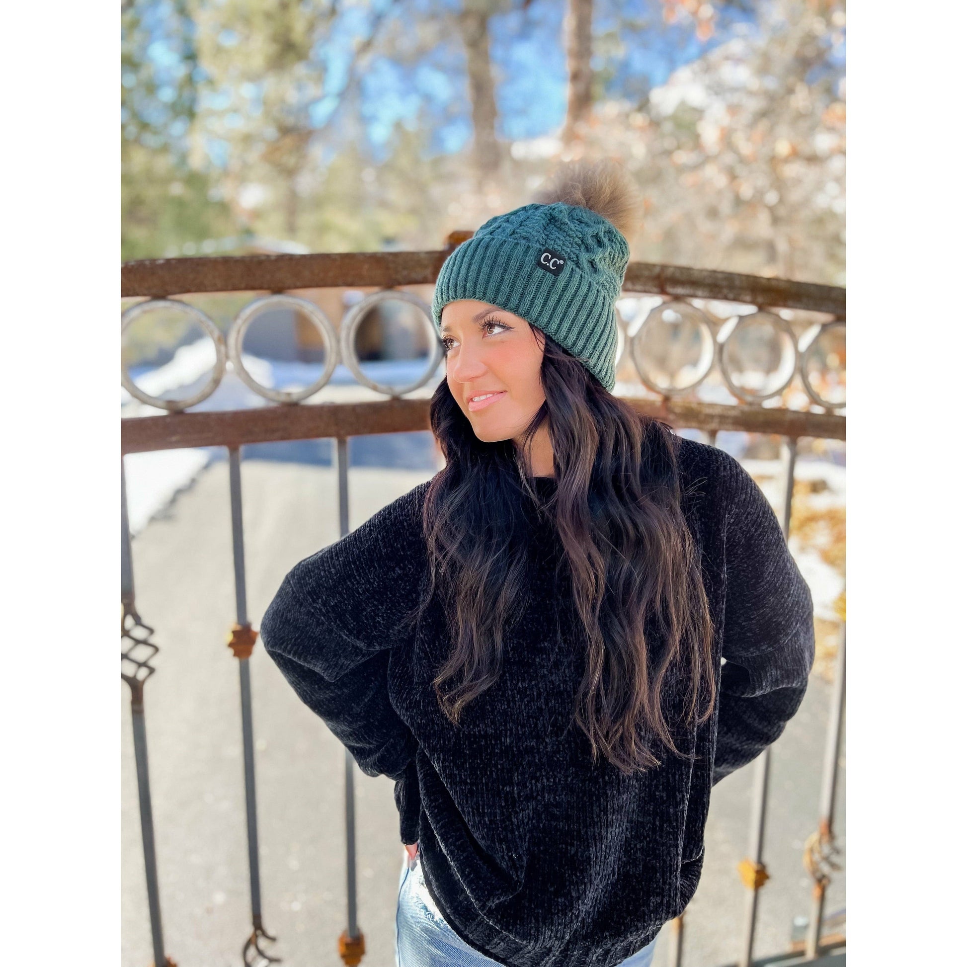 This Exclusive Black Label CC Beanie is adorable! It boasts a cable knit body, a ribbed cuff, and a fluffy fur pom on top. All the heart eyes when you wear this beanie!