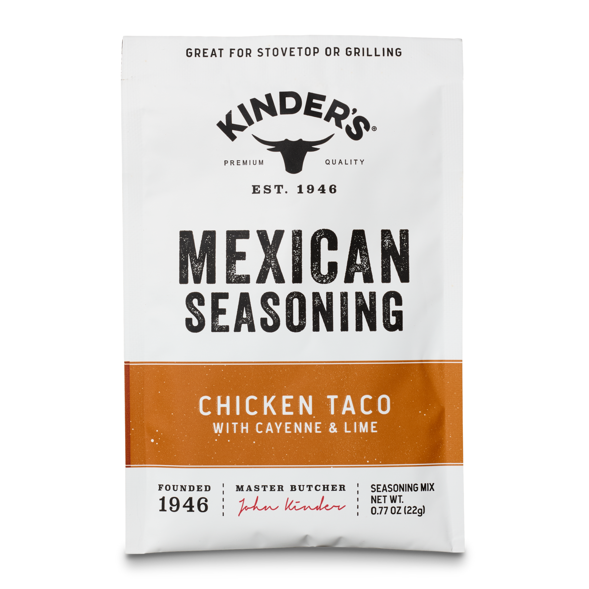 Kinder's new Chicken Taco Seasoning is our signature blend inspired by the traditional Mexican flavors of pollo asado-style grilled chicken. It is a blend of garlic, onion, mild chili, herbs, and spices that will make chicken the star of the taco. Try it with ground chicken for an easy weeknight meal. Or sprinkle it on grilled chicken and give them pollo asado tacos or fajitas. We can’t wait for you to try it.