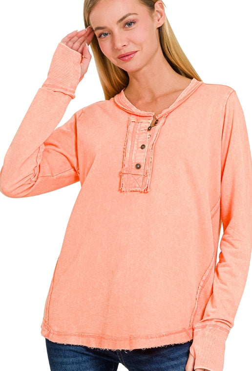 WASHED THUMB HOLE CUFFS BUTTON CLOSURE LONG SLEEVE TOP