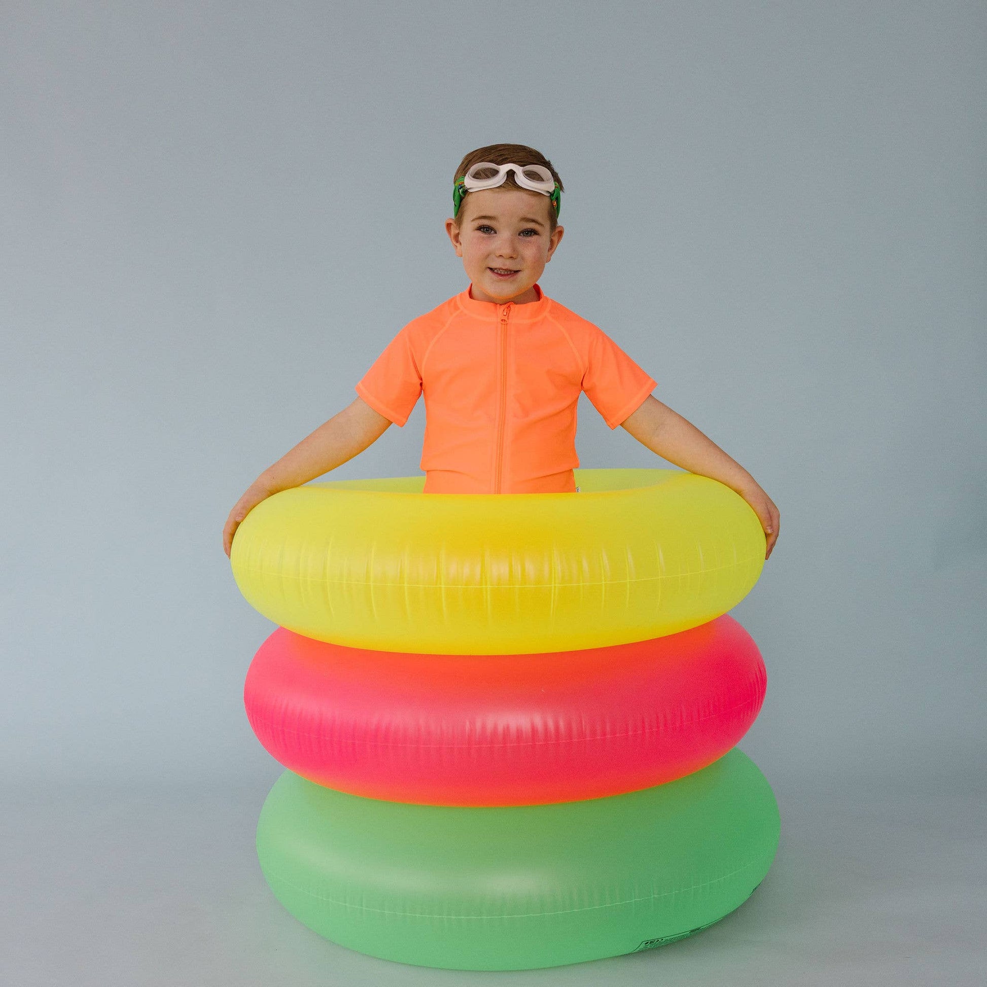 Our Level Up swim goggle features our tangle-free strap in a fun character print on a green background. Paired with a white frame and lightly tinted grey lenses.