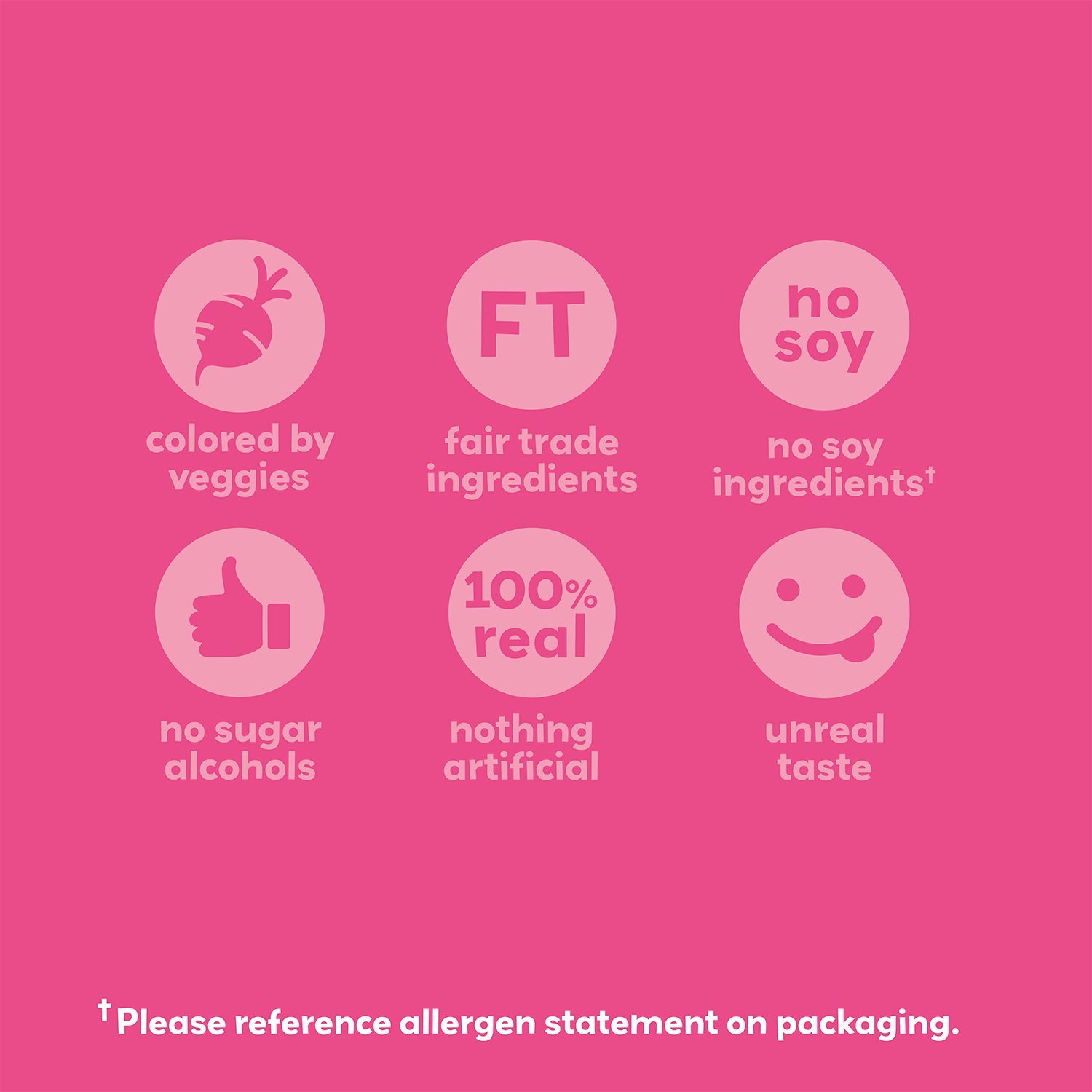 UNREAL is on a mission to build a world where you don't have to be afraid of your food, starting with your favorite indulgent snacks * ALL-NATURAL: our milk chocolates are made with RBST-free dairy, do not contain soy ingredients and are made in small batches with fair trade certified ingredients * COLORED BY NATURE: we only use colors from all-natural veggies such as spirulina and beets, and we never use titanium dioxide as a processing agent, as many similar products do * MADE FOR SHARING: These re-sealable bags each contain 5oz of milk chocolate gems