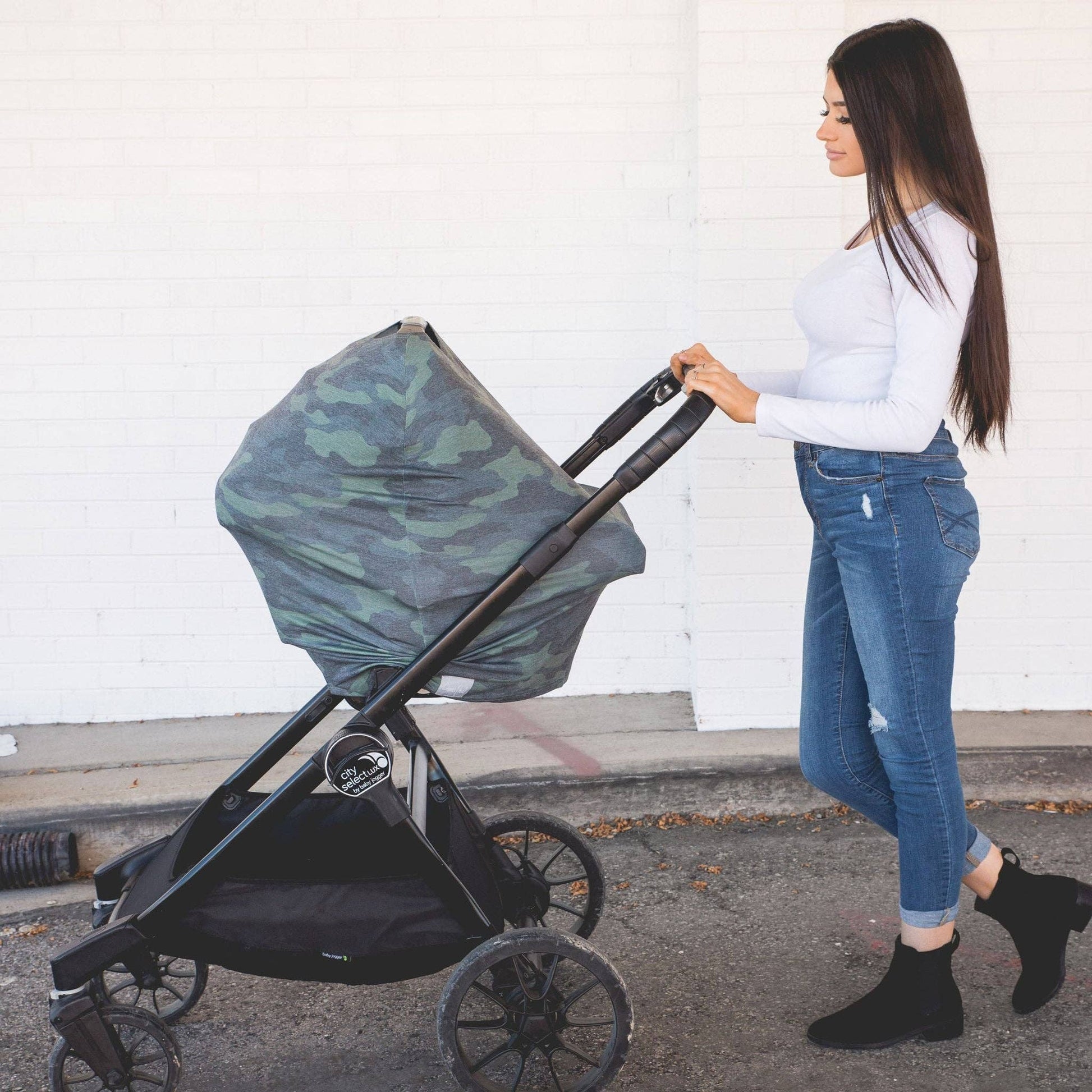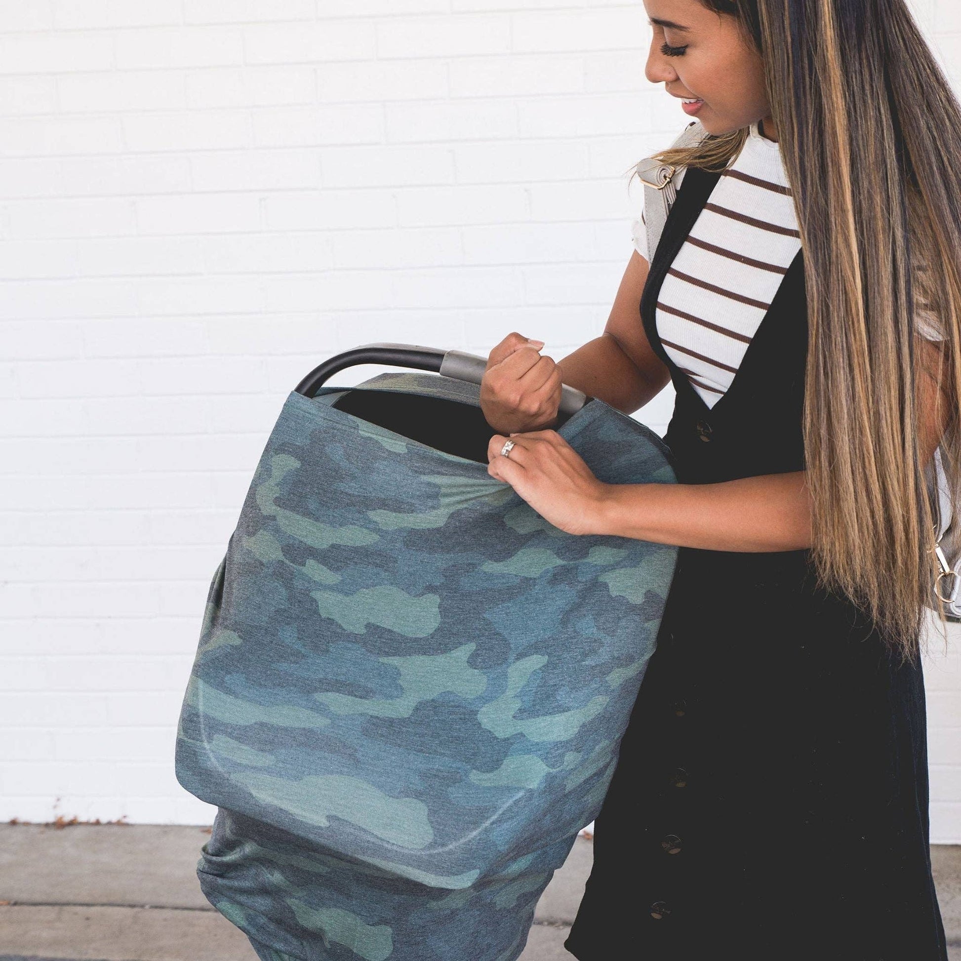 * Stretchy fabric fits most all car seats, shopping carts, high chairs and nursing mothers. It can also be a trendy infinity scarf! The green fabric with letters is gender neutral and trendy