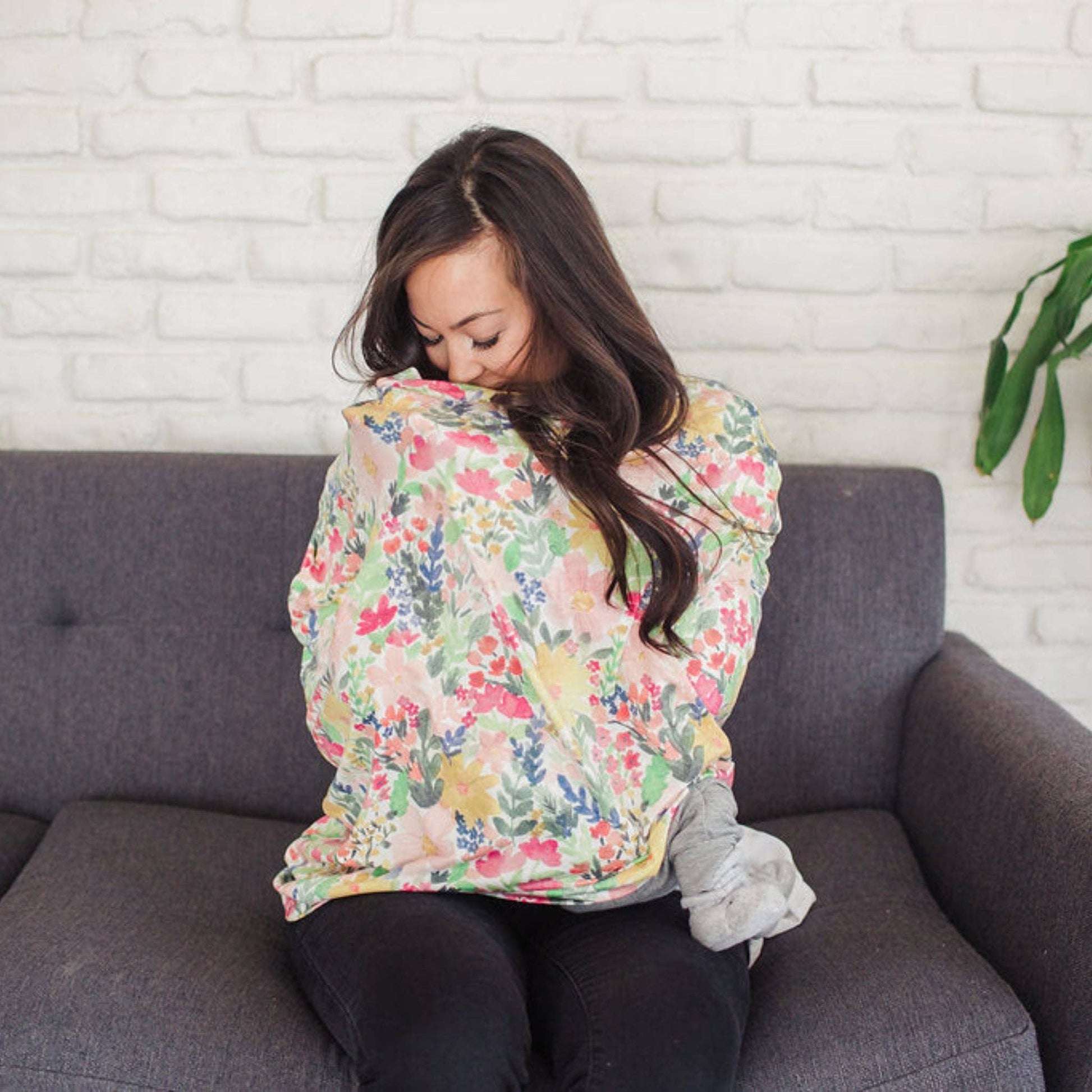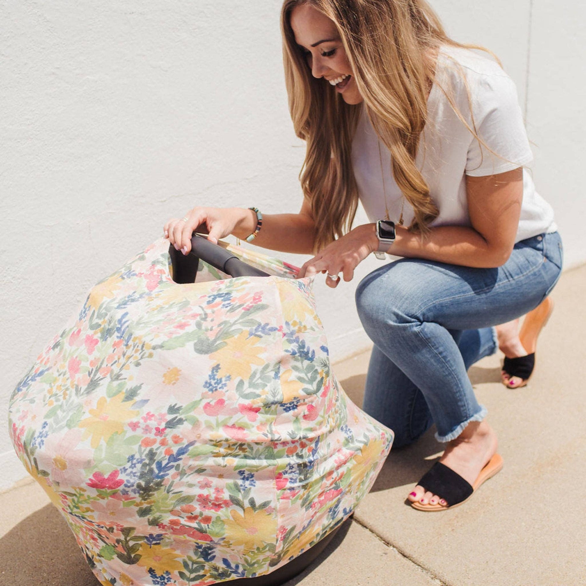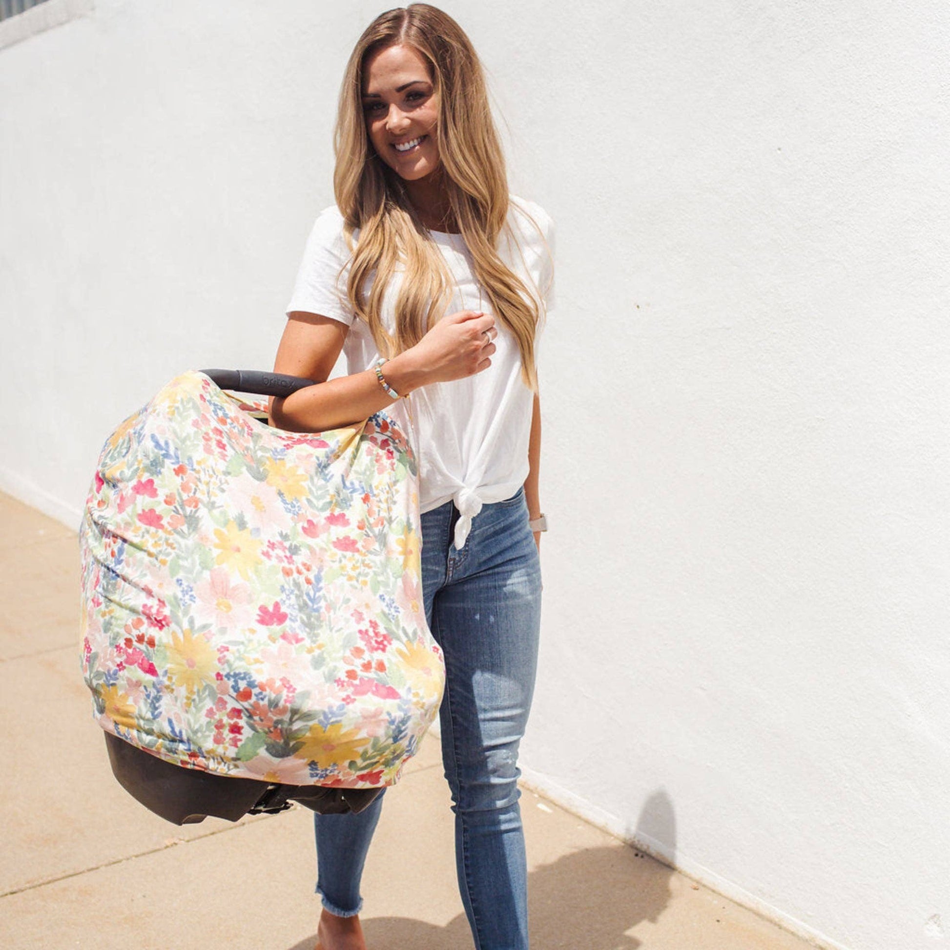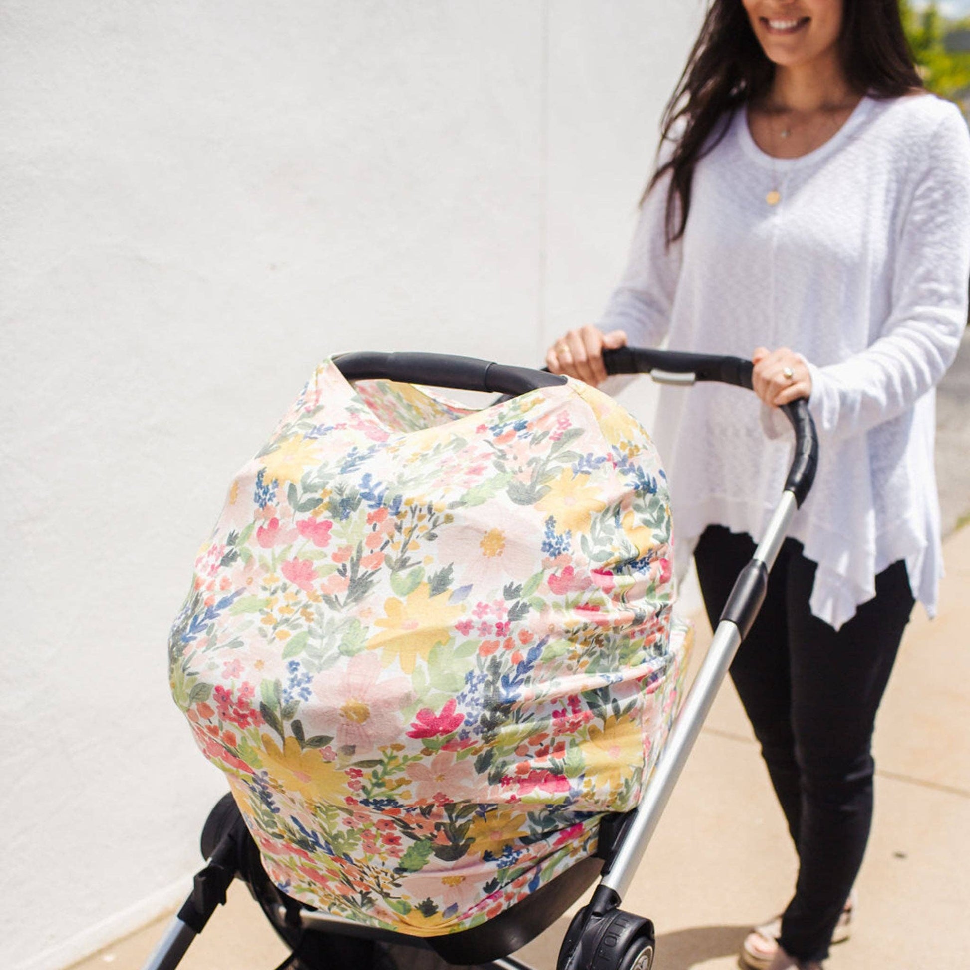 * Stretchy fabric fits most all car seats, shopping carts, high chairs and nursing mothers. It can also be a trendy infinity scarf! Our multi color floral fabric is trendy and perfect for baby girls