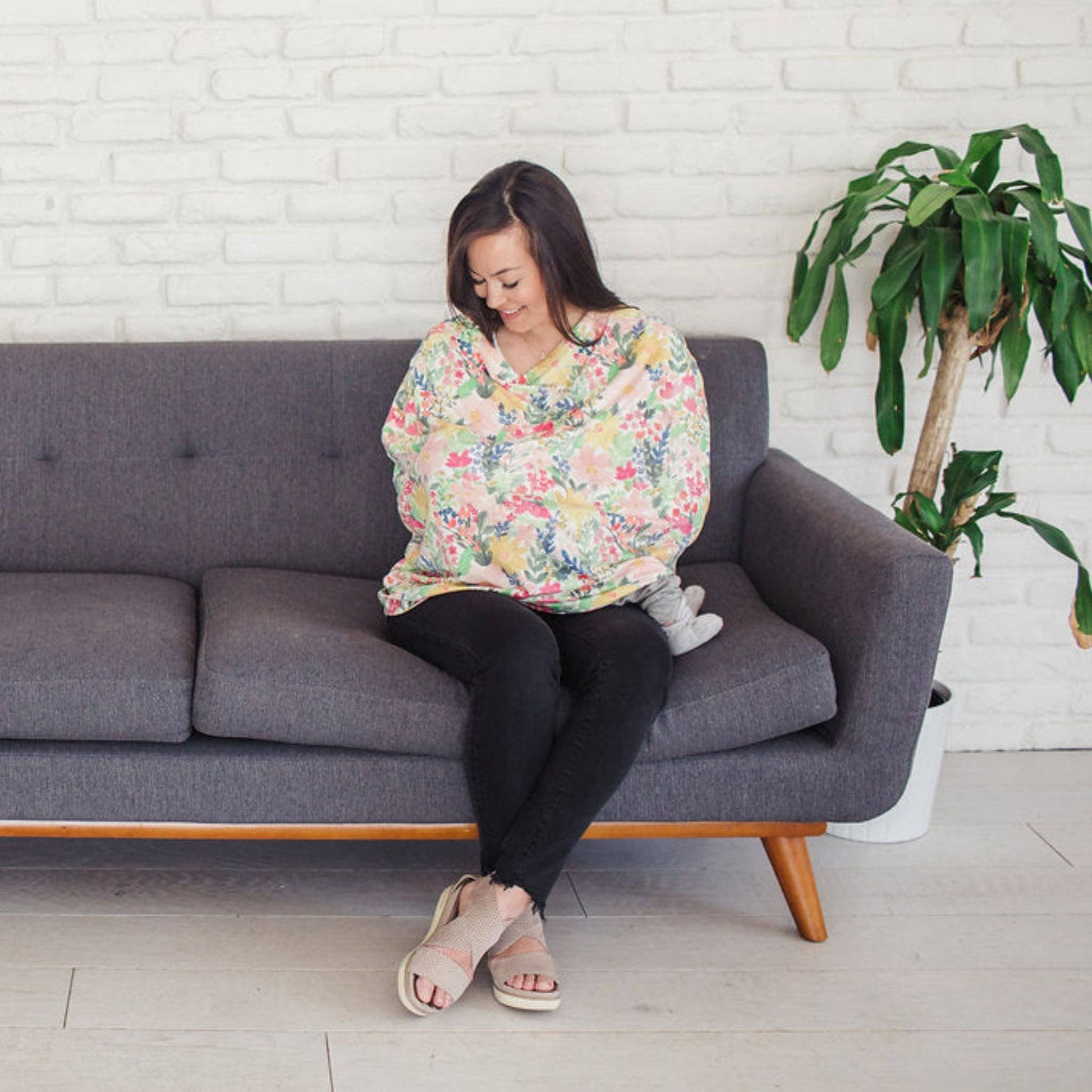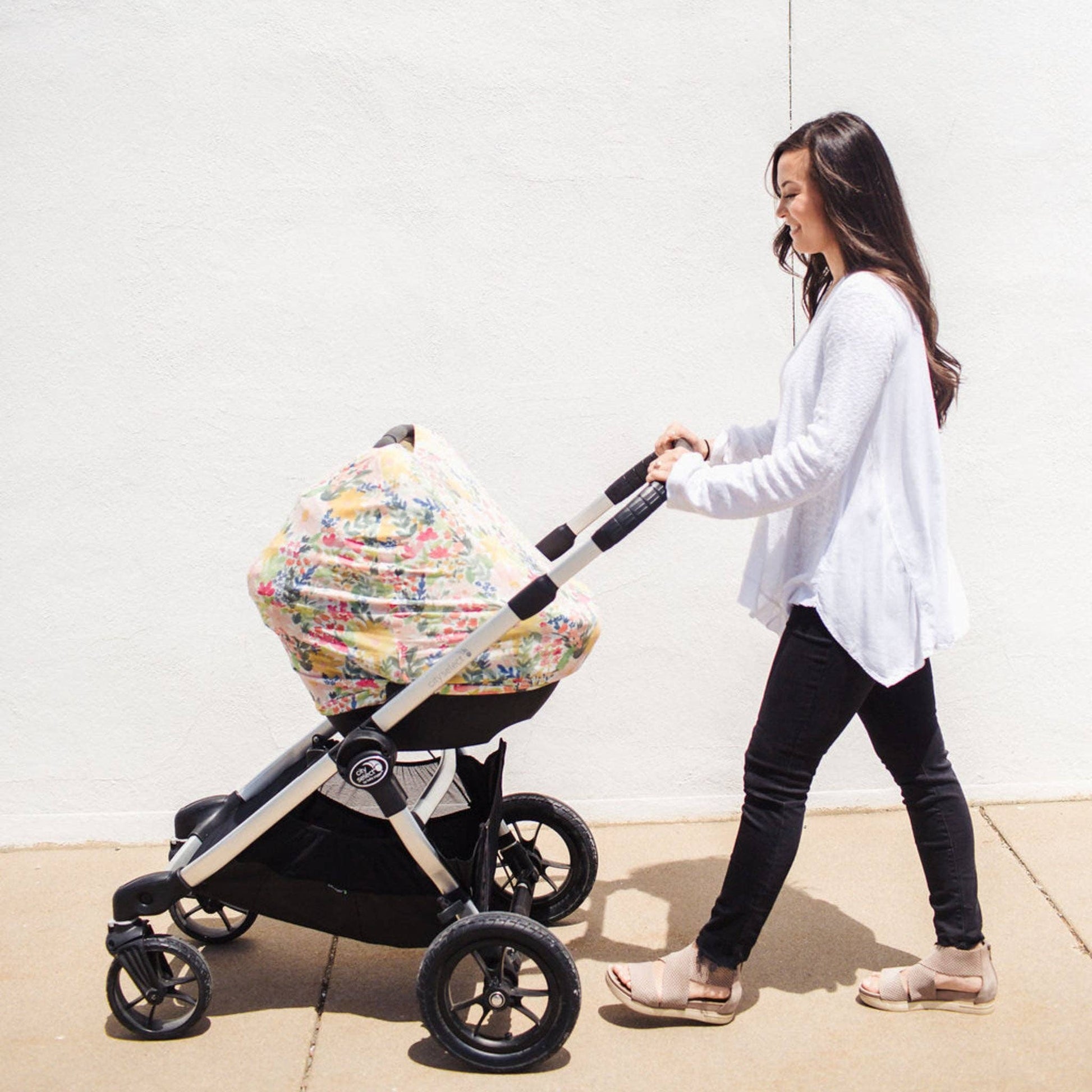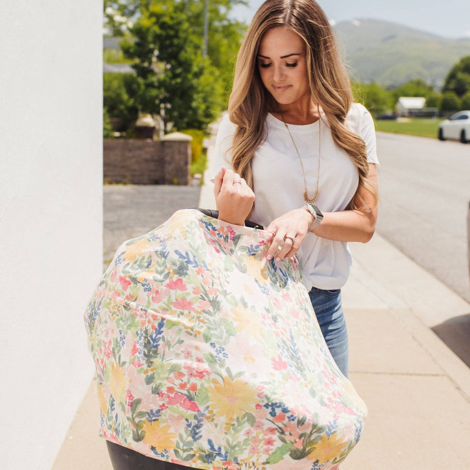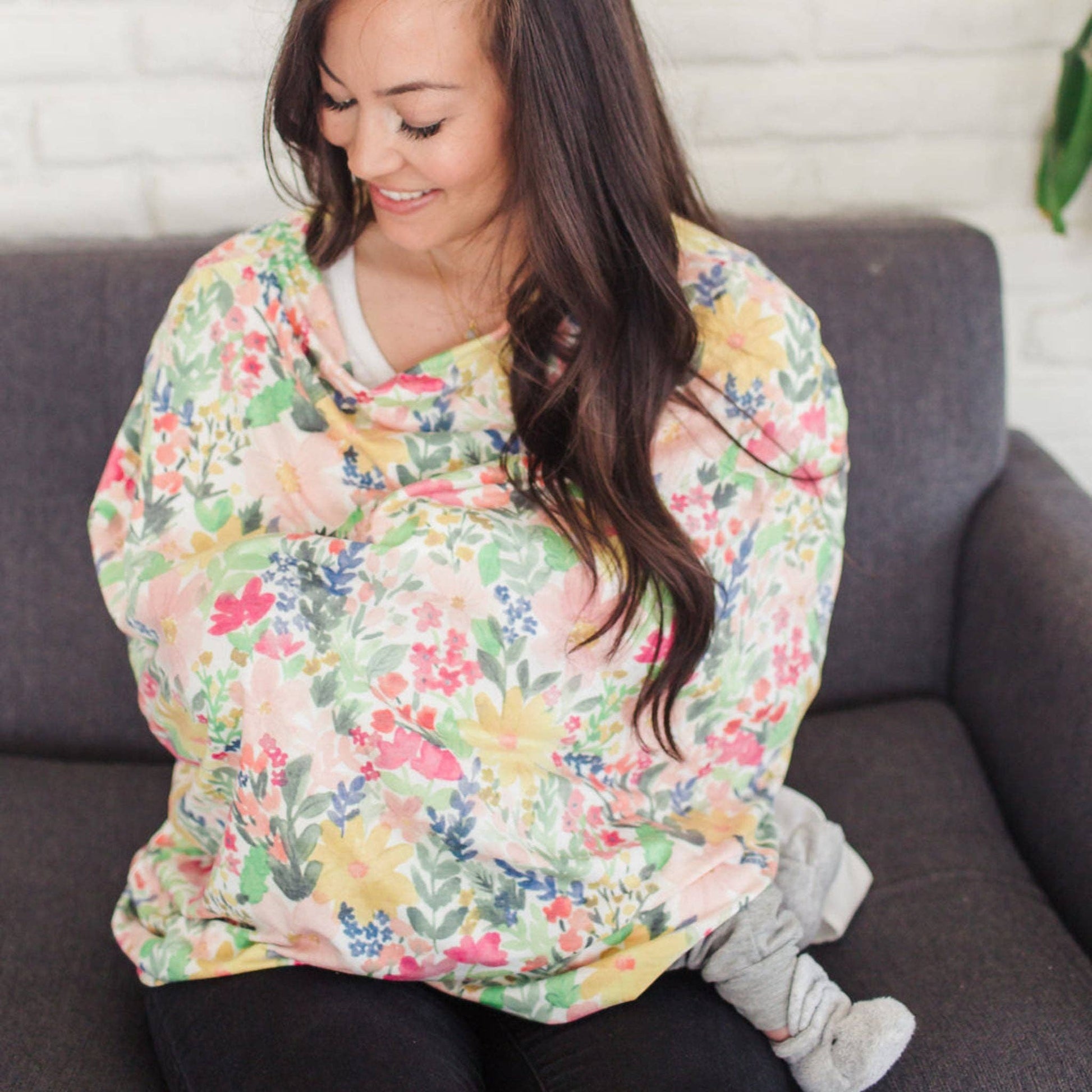 * Stretchy fabric fits most all car seats, shopping carts, high chairs and nursing mothers. It can also be a trendy infinity scarf! Our multi color floral fabric is trendy and perfect for baby girls