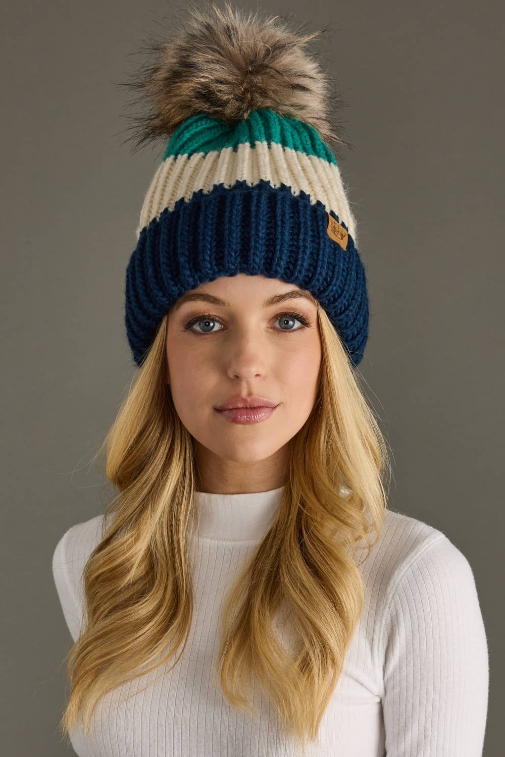 color block knit hat Natural faux fur pom accent Fleece lined 100% Acrylic