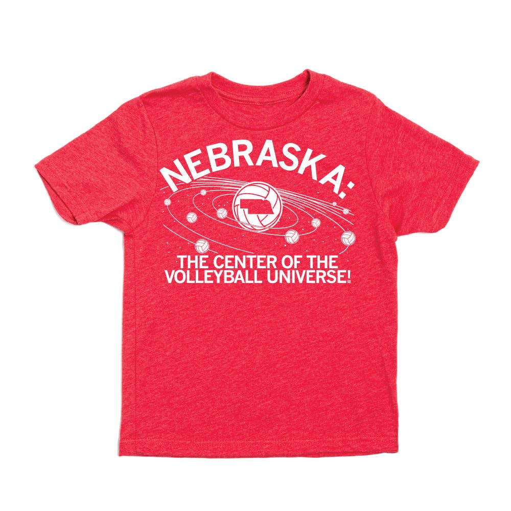 Nebraska: The Center Of The Volleyball Universe. White Screen Print on a Heather Red T-shirt (60% Combed Ringspun Cotton / 40% Polyester ). Cut and sewn sweatshop free. Designed printed by Union Labor at Raygun.