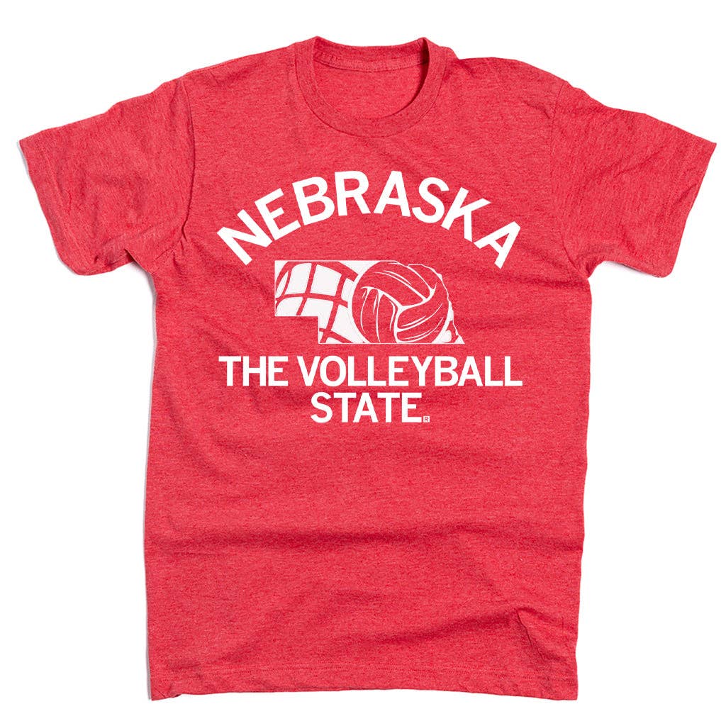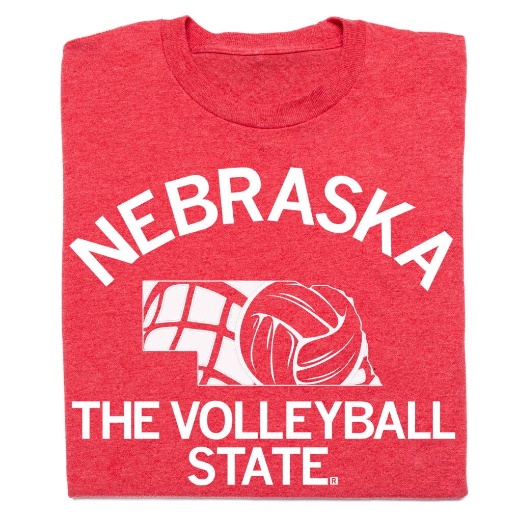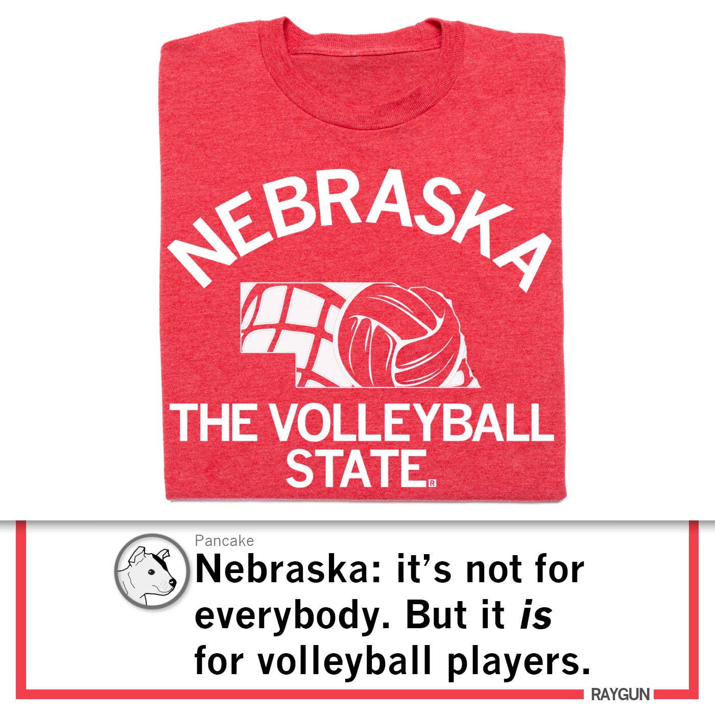 Nebraska: the volleyball state. A portion of all Raygun sales raise money for organizations that we support. White screen print on a heather red t-shirt (50% combed ringspun cotton / 50% polyester). Cut and sewn sweatshop free. Designed and printed by union labor at Raygun.