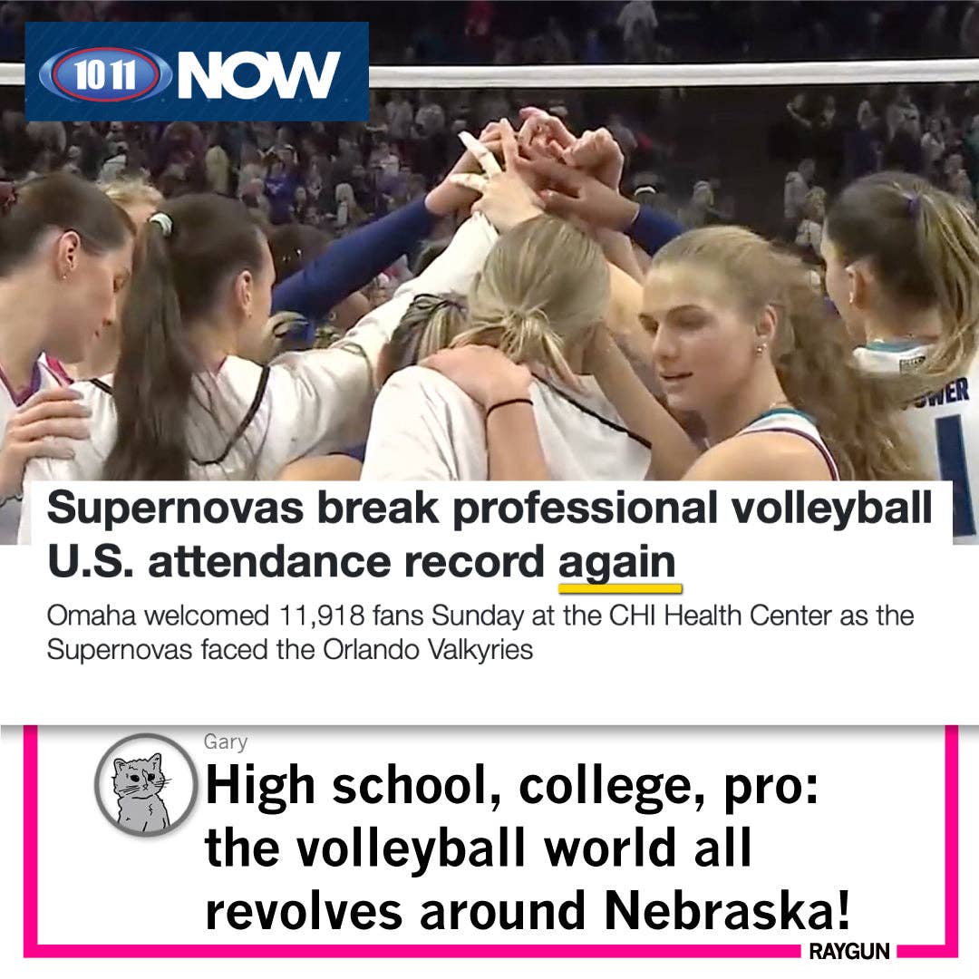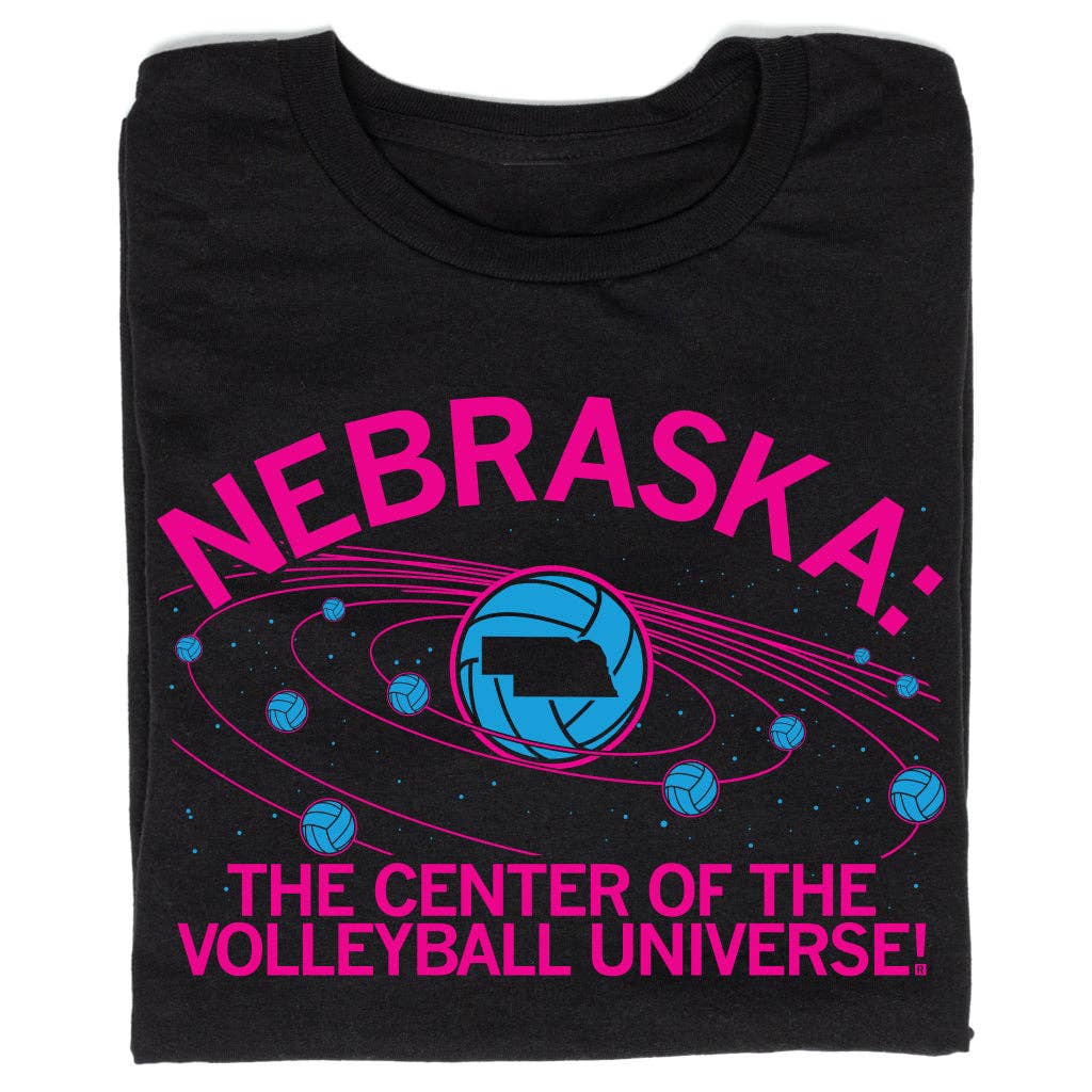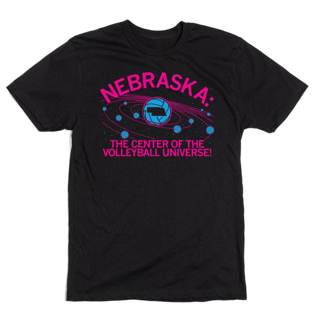 Nebraska: the center of the volleyball universe. A Portion of All RAYGUN Sales Raise Money For Organizations That We Support. Rhodamine Red Brite Blue Screen Print on a Black T-shirt (100% Combed Ringspun Cotton). Cut-sewn sweatshop free. Designed and Printed by Union Labor at RAYGUN.