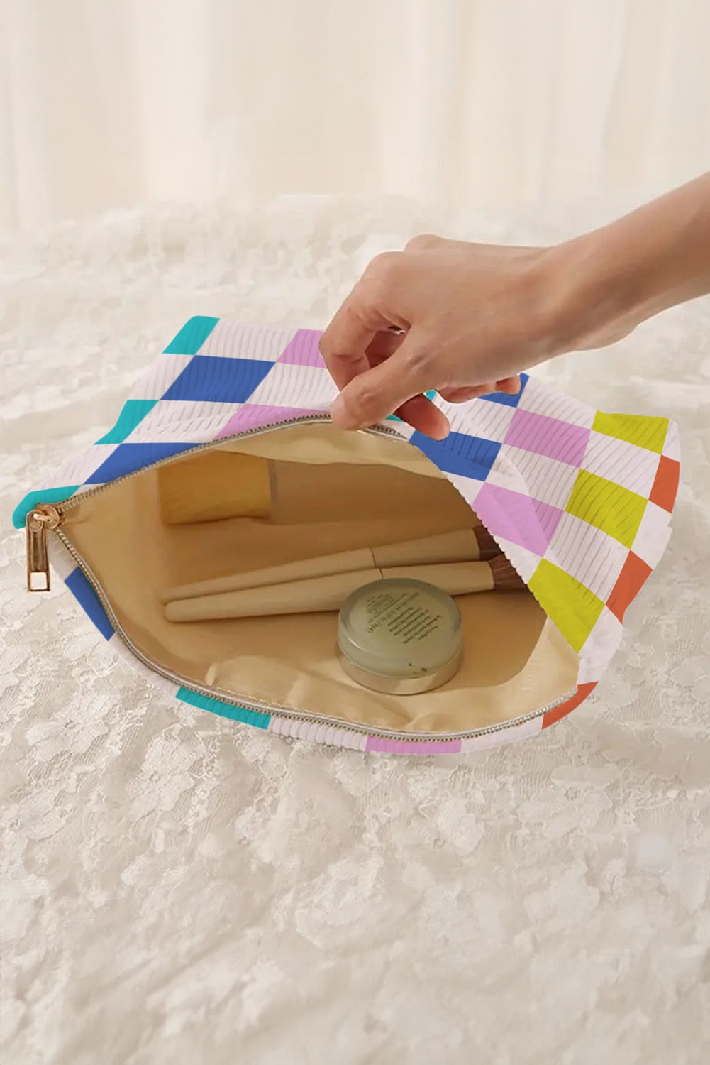 - Checkered pattern creates a chic and fashionable look for your cosmetic storage.