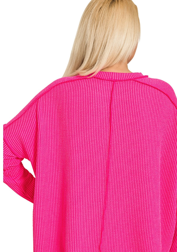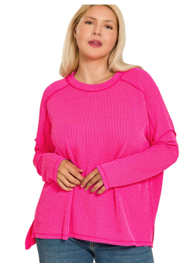 RAISED RIB RAW EDGE BOAT NECK LONG SLEEVE TOP