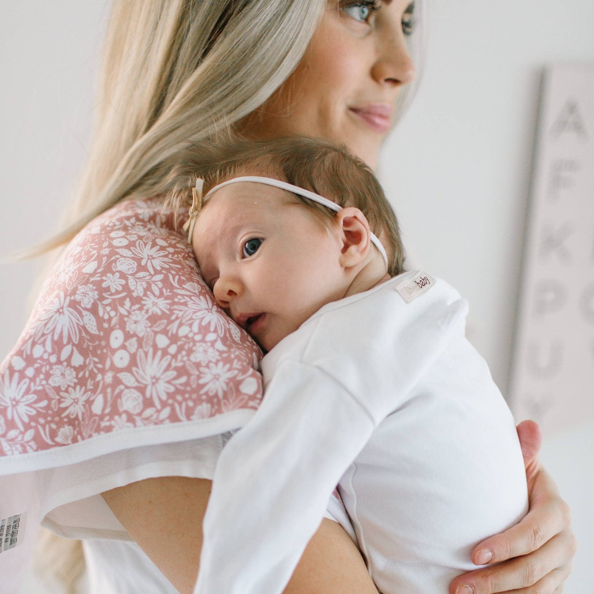 * Our burp cloths are designed with baby’s comfort in mind. That’s why we created them with 100% ultra-soft cotton layers on the front (patterned) and back (plain white). You can feel confident that baby will feel cozy against your shoulder while burping.