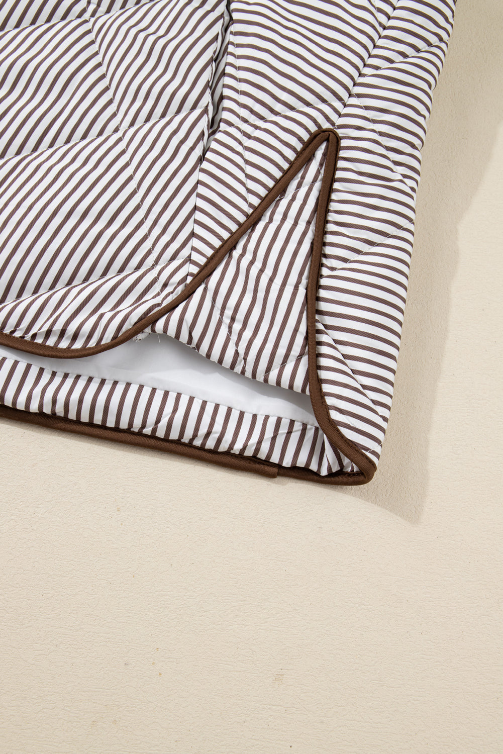 Brown Stripe Quilted Wavy Hem Snap Button Plus Size Vest