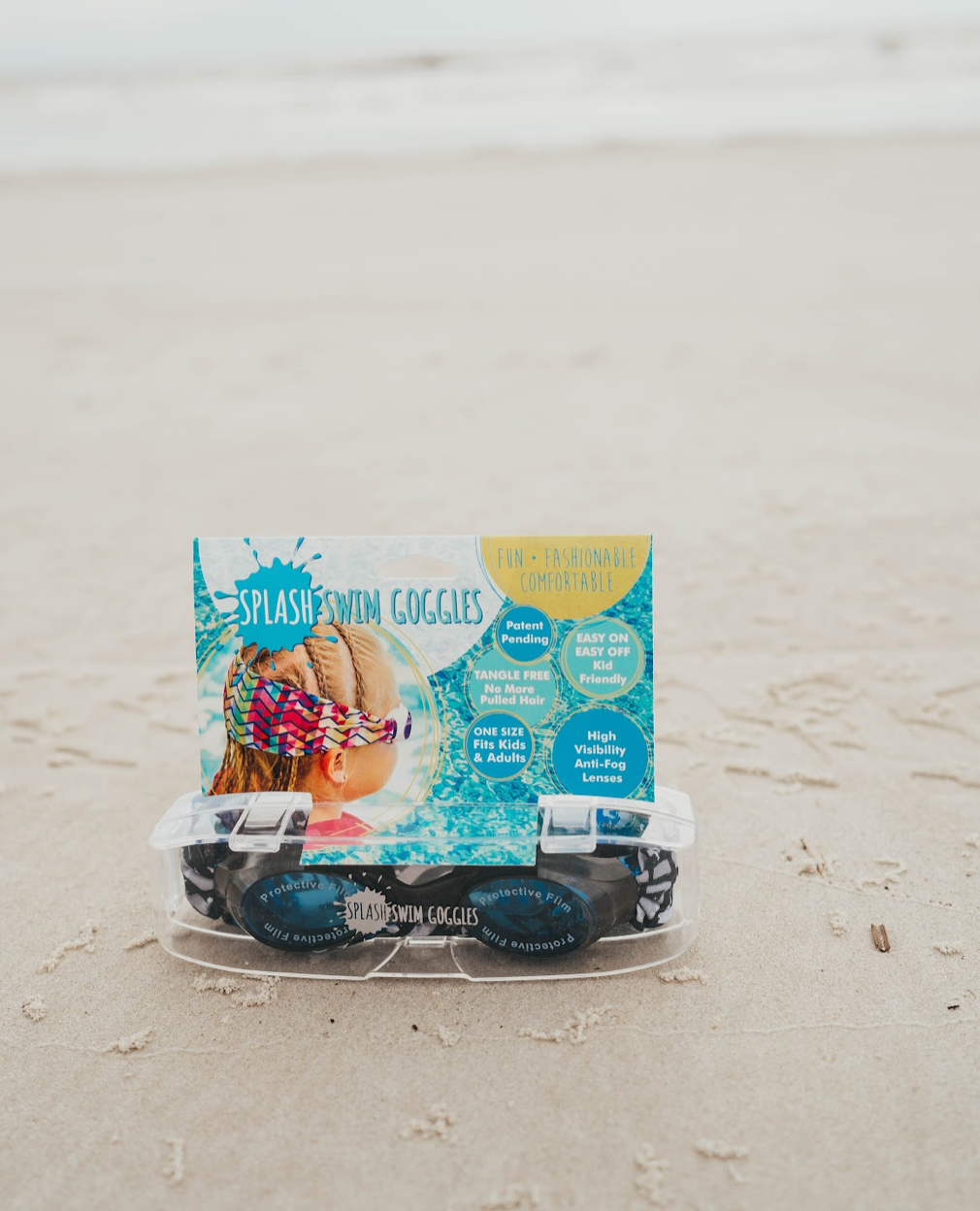 Our The Maze swim goggles feature our tangle-free, patent-pending strap in blue, grey and black paired with a black frame with lightly tinted blue lenses.