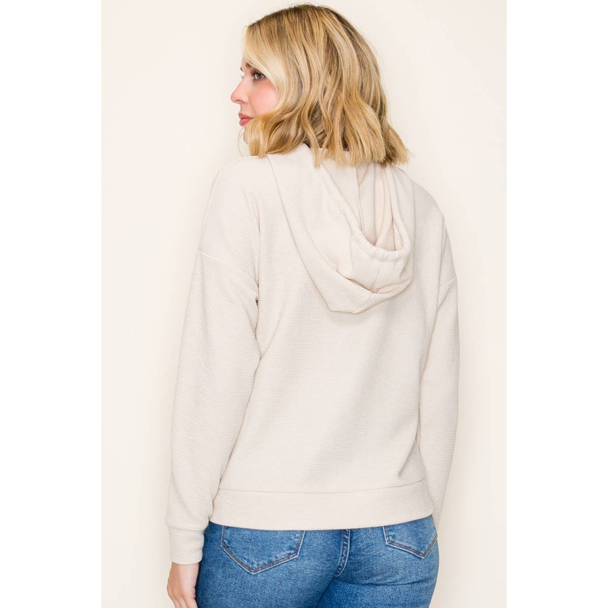 VARSITY TAPED HALF ZIP, DRAWSTRING NECK, LONG SLEEVE, TEXTURED, PULLOVER HOODIE TOP